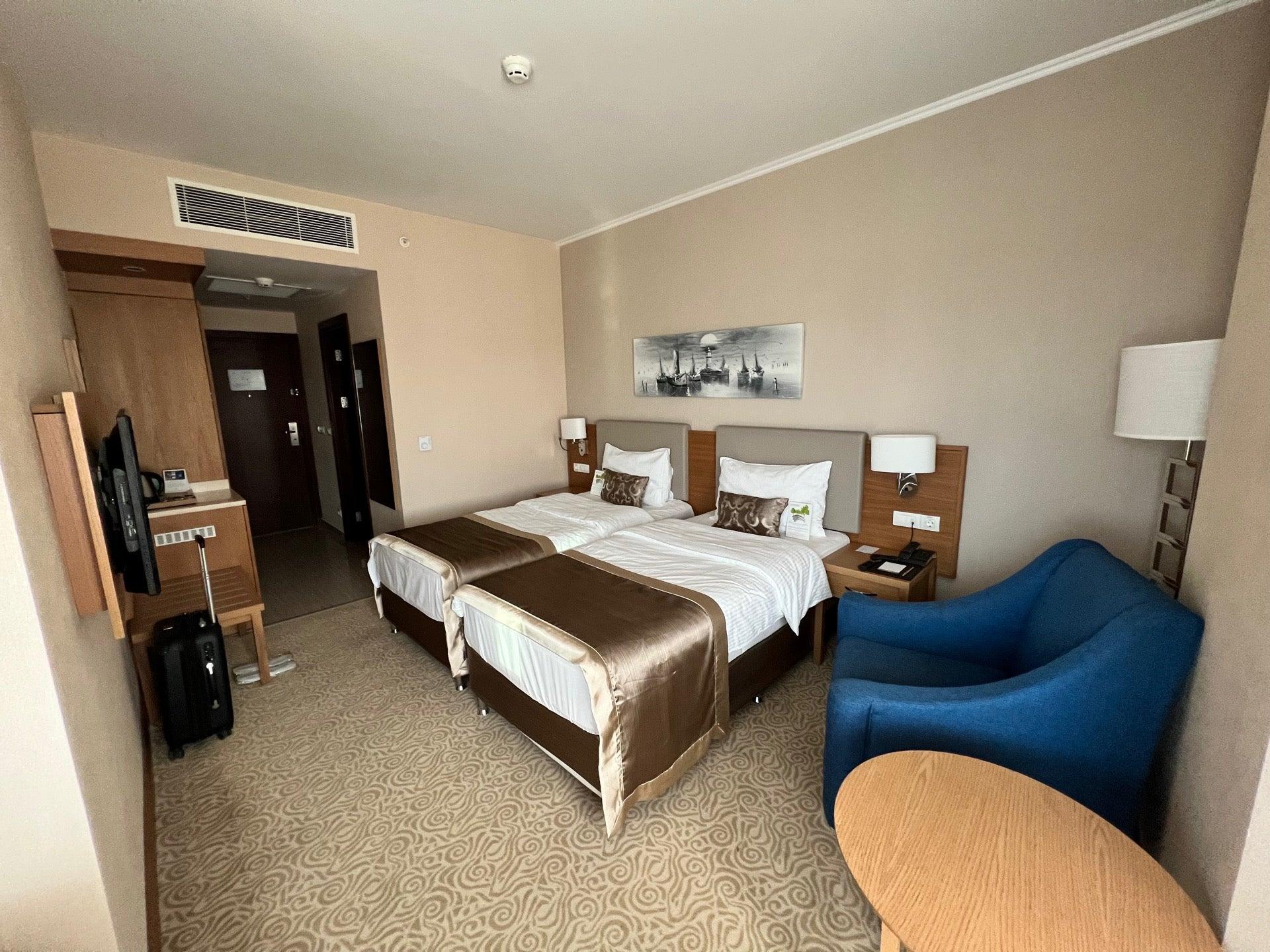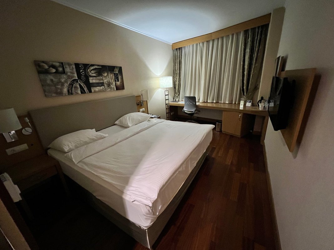 Хороший отель, не 5* конечно, но твёрдые 4. Утюг и доска в номере это плюс, отсутствие халата — минус. Кровать широкая, матрац и подушки удобные, чисто. Трансфер в аэропорт 3000тенге.