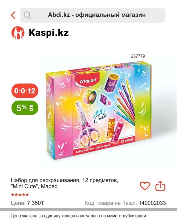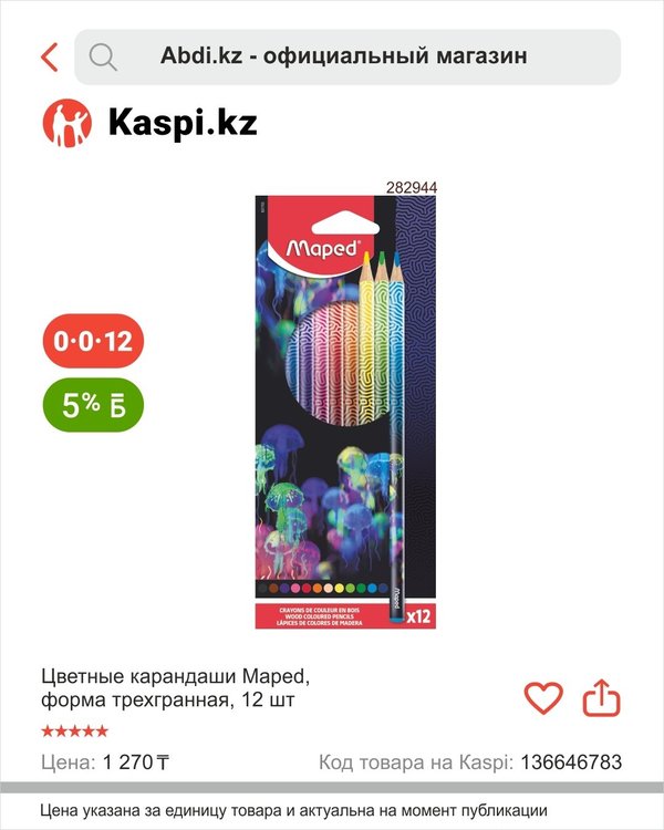 ичная новость, теперь ABDI в Kaspi Магазине! Вы можете найти оригинальные канцелярские товары от ABDI по привлекательным ценам и совершать покупки в любое удобное время для Вас. Выбирайте из ассортимента «Abdi.kz — официальный магазин» и наслаждайтесь простотой покупок онлайн в Kaspi Магазине. Например, Друзья, коллекцию «Deepsea Paradise» представляет бренд Maped. Коллекция, вдохновленная морем и медузами, с электрическими цветами и модным и стильным дизайном, несомненно, привлечет детей к невероятному творчеству!