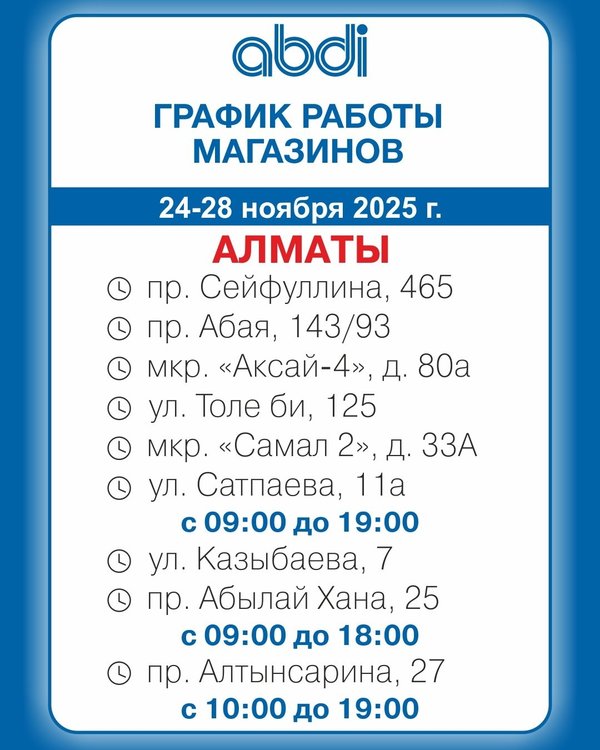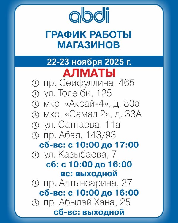 Құрметті клиенттер! 22 — 23 қараша 2025 ж. ABDI дүкендерінің жұмыс уақыты. ℹ️Толық ақпарат ABDI.kz сайтының «Розничная сеть» бөлімінде ____________________ Дорогие клиенты! График работы магазинов ABDI. 22 — 23 ноября 2025 г. ℹ️Подробная информация в разделе «Розничная сеть» на сайте ABDI.kz ⠀