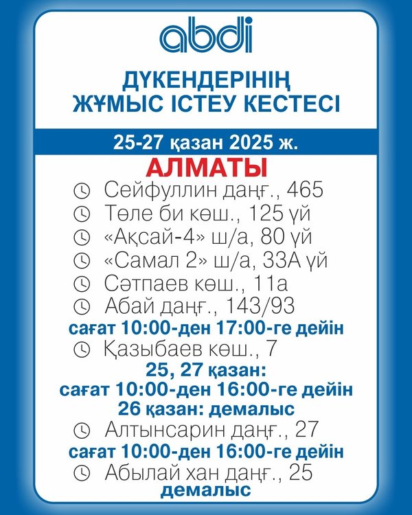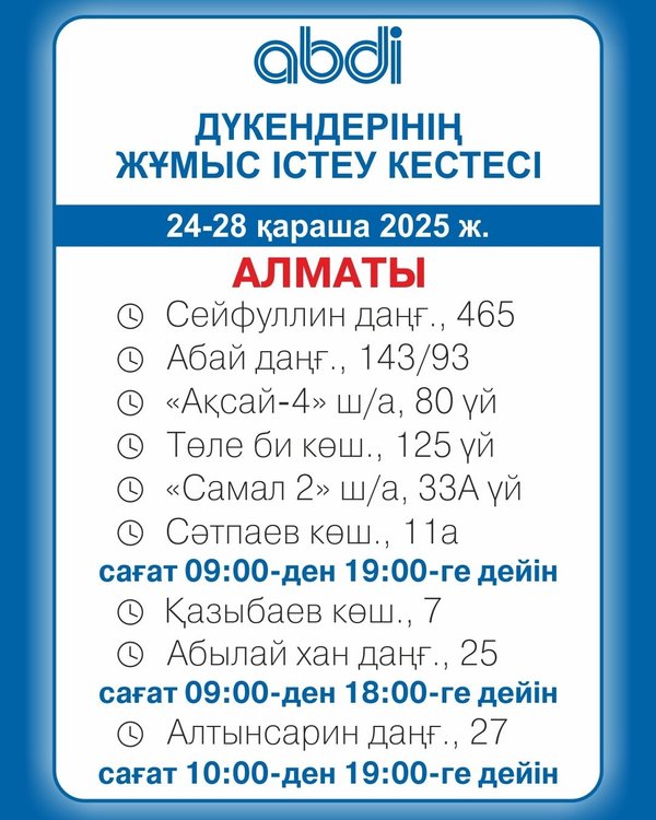 Құрметті клиенттер! 22 — 26 желтоқсан 2025 ж. ABDI дүкендерінің жұмыс уақыты. ℹ️Толық ақпарат ABDI.kz сайтының «Розничная сеть» бөлімінде ____________________ Дорогие клиенты! График работы магазинов ABDI. 22 — 26 декабря 2025 г. ℹ️Подробная информация в разделе «Розничная сеть» на сайте ABDI.kz ⠀