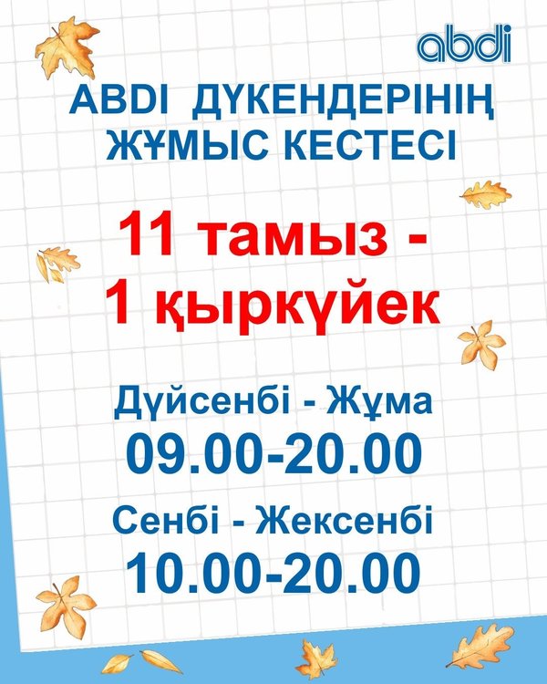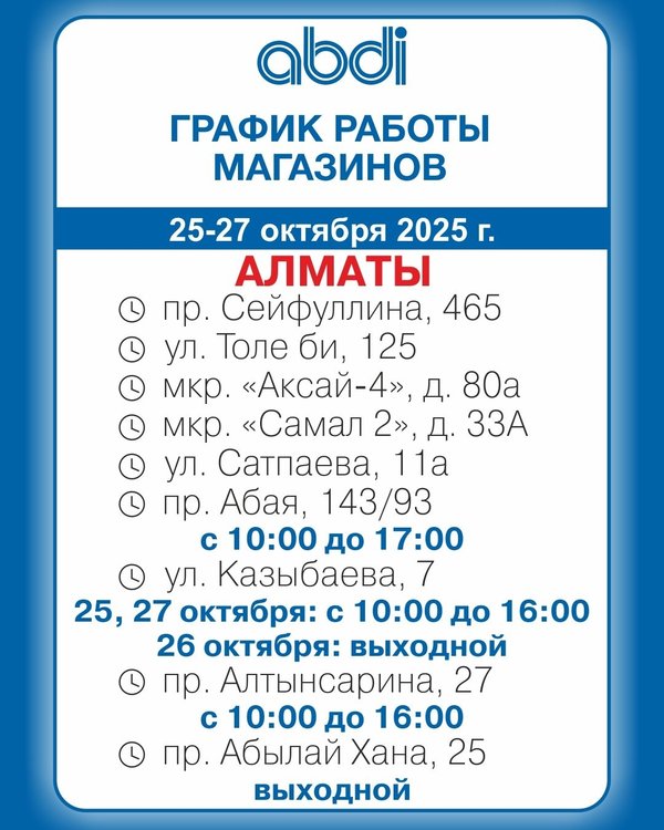 Құрметті клиенттер! 15 — 19 қыркүйек 2025 ж. ABDI дүкендерінің жұмыс уақыты. ℹ️Толық ақпарат ABDI.kz сайтының «Розничная сеть» бөлімінде ____________________ Дорогие клиенты! График работы магазинов ABDI. 15 — 19 сентября 2025 г. ℹ️Подробная информация в разделе «Розничная сеть» на сайте ABDI.kz ⠀