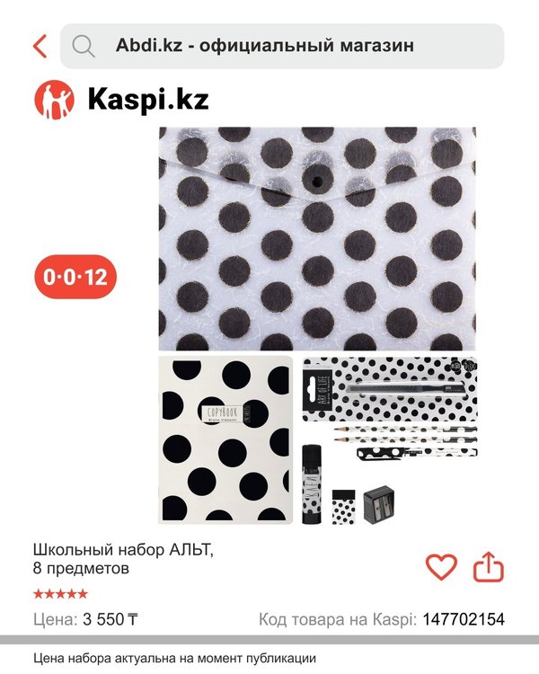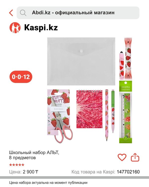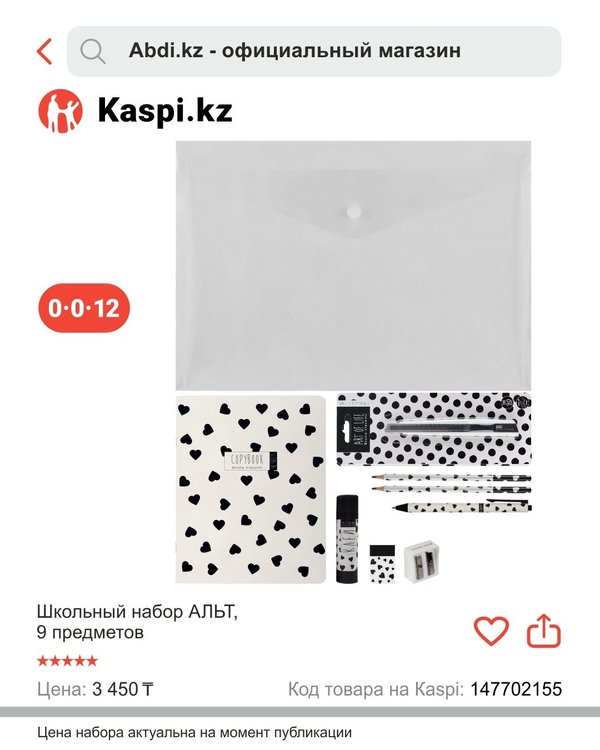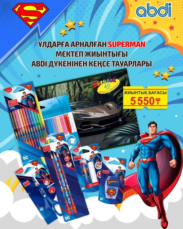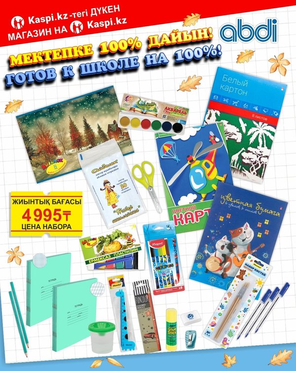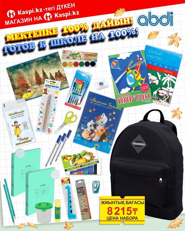 ықта! Ұлдар мен қыздарға бірдей қолайлы Дайын шешім — уақытты үнемдеу Жедел жеткізу ABDI в Kaspi Магазине и в интернет магазине abdi.kz предлагает оригинальные канцелярские товары по привлекательным ценам и предоставляет возможность совершать покупки в любое удобное время для Вас. Выбирайте из ассортимента «Abdi.kz — официальный магазин» и наслаждайтесь простотой покупок. ️ Готовимся к школе вместе! ️ Первый звонок уже не за горами, а это значит — пора купить набор первоклассника! Мы собрали всё необходимое в одном наборе. Удобно, выгодно и без стресса — всё, что нужно вашему будущему школьнику, уже в одном наборе. Подходит для мальчиков и девочек Готовое решение — не нужно тратить часы Быстрая доставка