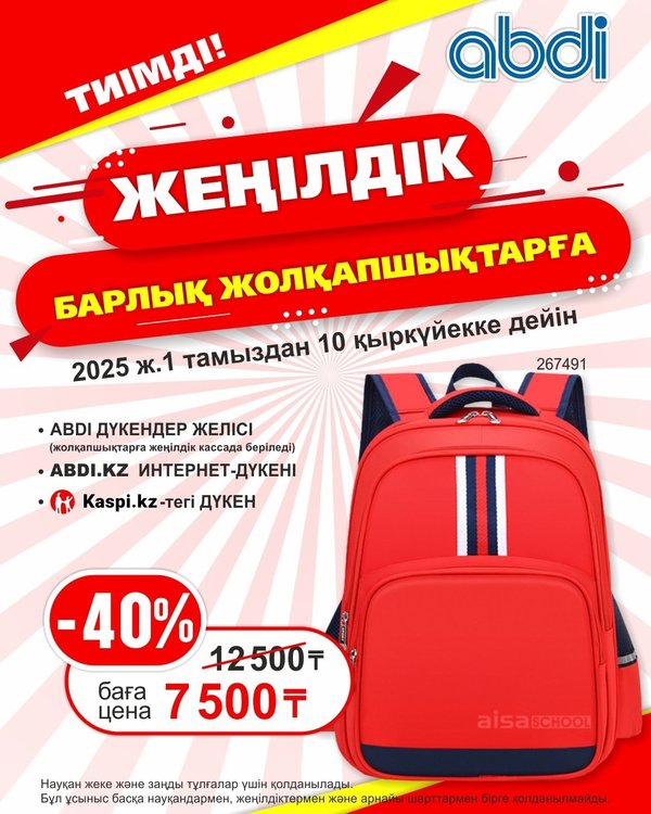 Тиімді Науқан – барлық жолқапшықтарға -40% жеңілдік Бұндайды өткізіп алуға болмайды! Науқан уақыты шектеулі! Жолқапшықтар — ыңғайлы және жеңіл, ең бастысы функционалды! Выгодная Акция — скидка 40% на все рюкзаки Такое нельзя пропустить! Период Акции органичен! Рюкзаки — удобные и легкие, а главное функциональные!