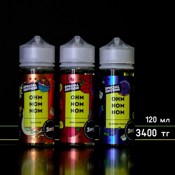 OHM NOM NOM 120 ml 3400 тг Mister Teababe — Освежающий зеленый чай с лесными ягодами и хвоей Donut break — Сочный и сладкий пончик с клубникой Lemonhead pie — Кисло-сладкий лимонный пирог Choco Cooka — Шоколадное печенье с молоком John Cinnamon — Сладкая и нежная булочка с корицей прямо из духовки Chilling Nuts — Ассорти из лесных орехов в яблочной глазури