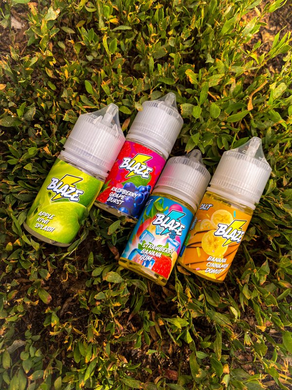 BLAZE 100 мл 3500 тг Apple Kiwi Splash. Фреш из яблока и киви. Banana Cinnamon Donut. Пончик с бананом и корицей. Blueberry Cream Tube. Трубочка с кремом и голубикой. Raspberry Watermelon Сandy. Конфета со вкусом малины и арбуза. Mango Orange Twist. Тропический вихрь из манго и апельсина.