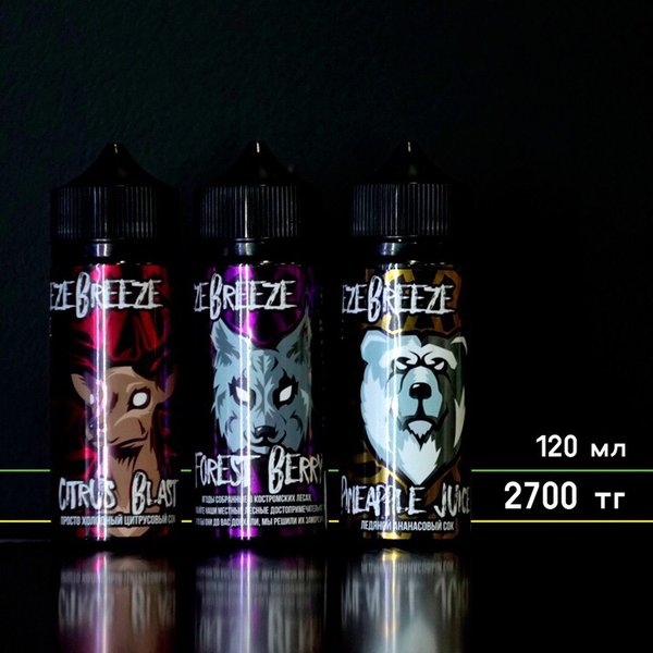 FREEZE BREEZE 120 ml 2700 тг Tropical Boom — Смесь тропических фруктов со льдом Citrus Blast — Холодный цитрусовый сок Peach Apple — Микс из персика и яблока с холодком Forest Berry — Освежающие лесные ягоды Pineapple Juice — Ледяной ананасовый сок Juice Grape — Сочный виноград с кулером Strawberries&Peach Smoothies — Клубнично-персиковый смузи со льдом Blueberry ICE — Замороженная черника Cherry Juice — Вишня с холодком