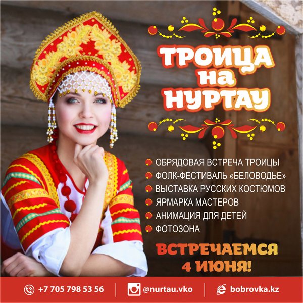 есторана «Намедни». Начало в 10:30 Внимание! До 11:00 для всех желающих посетить праздник организован бесплатный въезд на курорт. В программе: — музыкальная программа — встреча Троицы — выставка русских народных костюмов — пляска-кадриль с хореографом — ярмарка мастеров Восточного Казахстана — веселая анимация для детей — красивая фотосессия у фотозоны в традиционно русском стиле * Троица один из главных христианских праздников, отмечается на пятидесятый день после Пасхи, потому называется еще Пятидесятницей. В этом празднике, помимо непосредственно православных традиций, присутствуют и черты древних языческих обрядов.