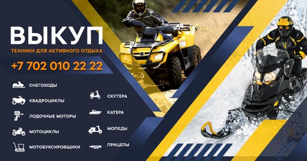 ныңыздың нөмірін қалдыруыңызға болады. ⠀ Выкуп техники для активного отдыха! Быстро и выгодно! Выкупаем независимо от марки, модели года выпуска или пробега по справедливой цене. Предлагаем наиболее выгодные условия: выкуп, комиссия, Trade-In. Процесс выкупа и оформления очень простой: — бесплатный предварительный осмотр техники; — осмотр сезонной техники можно осуществить по фото/видео; — Расчет наличными в течении 24 часа. Для получения более подробной консультации можно позвонить по номеру:, либо оставить свой контактный номер телефона.