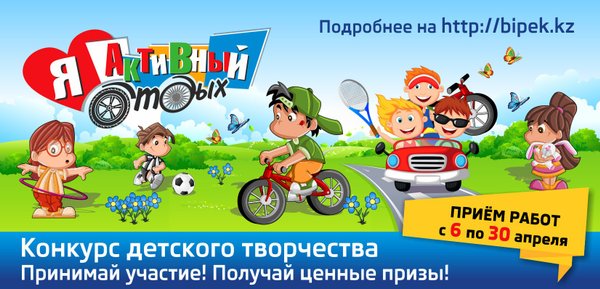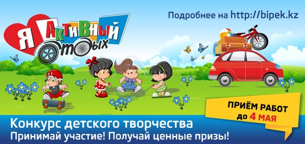 Отличная новость для тех, кто еще не успел принять участие в конкурсе детского творчества «Я активный отдых»! По многочисленным просьбам мы продлили сроки приема работ до 4 мая! К участию приглашаются дети от 4 до 14 лет. Торопись! Не упусти свой шанс выиграть чудесные подарки! Заполнить анкету участника и отправить работу можно на сайте:. Также можно принести оригинал работы в филиал компании «БИПЭК АВТО» в вашем городе. Условия конкурса:
