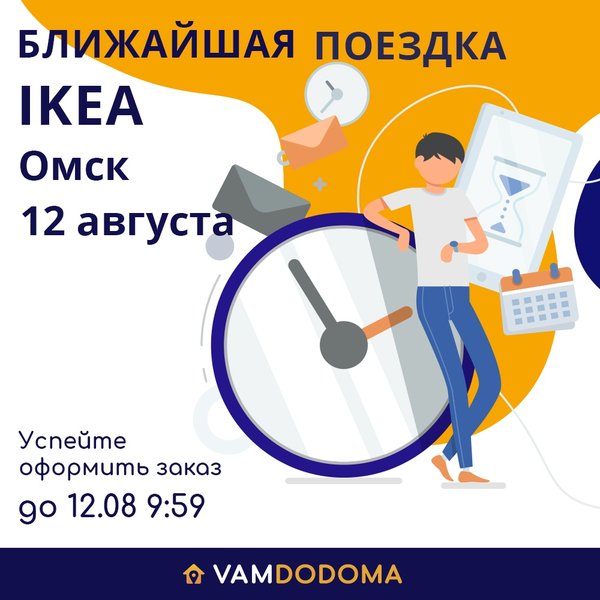 Ближайшая поездка в магазин IKEA Омск 5 августа Успейте оформить доставку до 5 августа 9:59 Оформить заказ можно на сайте vamdodoma.kz Доставка: До дома: 10.08 и 11.08, Сб, Вс Самовывоз: 10.08, Сб c 14:00 г. Усть-Каменогорск, ул. Сагадата Нурмагамбетова д. 55 | | Ежедневно с 9 до 20