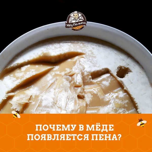 ы и её высокий удельный вес дает неоднородность массе меда: на его поверхности образуется рыхлый белый слой. Такую пенку можно кушать или использовать в косметологии, например проводить банные процедуры или делать медовый массаж. В таком случае она цениться даже выше чем простой мёд, т. к. пенка насыщена кислородом и глюкозой. Опасения может вызывать только пенка образующаяся в процессе брожения мёда, когда влажность продукта составляет выше 21%. В процессе брожения пена образуется с крупными пузырьками и иногда в виде «шапки». При этом мёд приобретает специфичный винный запах, а вкус становится кислый и не приятный. Кушать такой мёд не стоит, но из него можно сделать отличную Медовуху или Хмельной мёд.