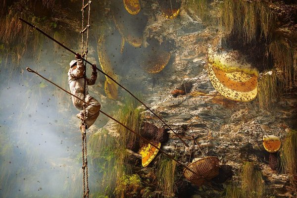 тными жителями Непала и Китая. В небольших дозах он может быть эффективен при лечении целого ряда заболеваний, начиная с повышенного кровяного давления и диабета до сексуальных проблем. В больших дозах этот мёд может быть опасен или даже смертелен. Всё дело в доступе к цветкам рододендрона – он имеется только у горных пчёл. Многие виды рододендрона содержат ядовитые для человека андромедотоксины. Они встречаются в Бутане, в китайской провинции Юньнань, в Индии и Непале. Гималайские пчёлы живут в скалах, где растут такие ядовитые рододендроны ((Rhododendron luteum и Rhododendron ponticum) и собирают их нектар. Полученный из такого нектара мёд обладает действительно мощными свойствами. Он одновременно является и сильным галлюциногеном, и рекреационным препаратом, который может использоваться медицинских целях. Заполучить этот неуловимый мёд — не простая задача. В дополнение к тому, что вы работаете с пчёлами, что уже рискованно, вы должны выдержать восхождение и работу на вершинах Гималаев. Пчёлы создают улья высоко на отвесных сторонах гималайских гор, выше 2500 метров. Это означает, что один неверный шаг может стоить вам жизни. Племя Гурунгун (Gurungun) – так обычно называют людей – охотников за мёдом. Эти смелые люди очень рискуют, чтобы заработать себе на жизнь, добывая редкий мёд. Ульи вырастают в диаметре до 5 футов и могут содержать до 60 кг меда каждое, впечатляющий выход. Мёд собирается из ульев два раза в году, весной и осенью. Считается, что в результате бурного цветения весной, мёд, добываемый в этот период, кажется, оказывает более сильный эффект на организм и в свою очередь, является самым популярным среди охотников за этой мистической субстанцией.