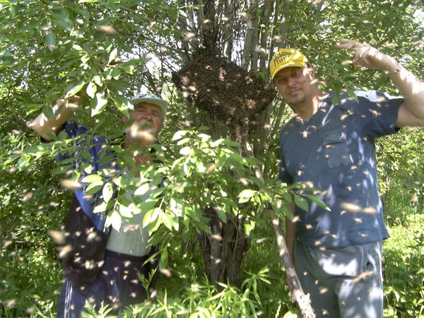 К примеру — поймать вылетевший из улья рой не так то просто. Иногда получается его поймать на пустую рамку, а иногда рой садится на дерево и тогда надо спиливать целую ветку, чтобы рой снять.