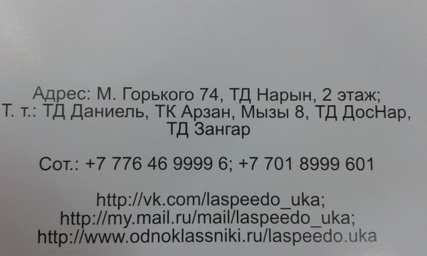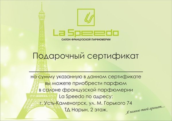 1⃣7⃣. 0⃣1⃣. 2⃣0⃣1⃣5⃣ года открытие нового салона французской парфюмерии La Speedo в ТД Тамирлан, 1 этаж! В честь открытия вас ждут скидки, праздничная лотерея и Подарки от компании La Speedo Живите ярко и подарите себе настроение А также наши адреса: ТД Нарын,2 этаж; Независимости 8/1,3 этаж. Будем рады Вас видеть!