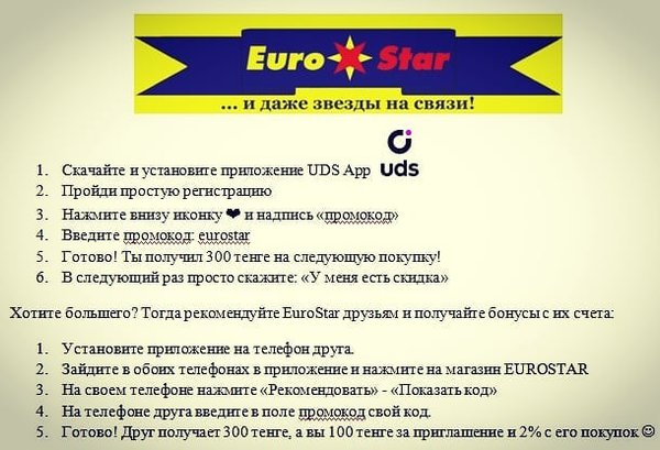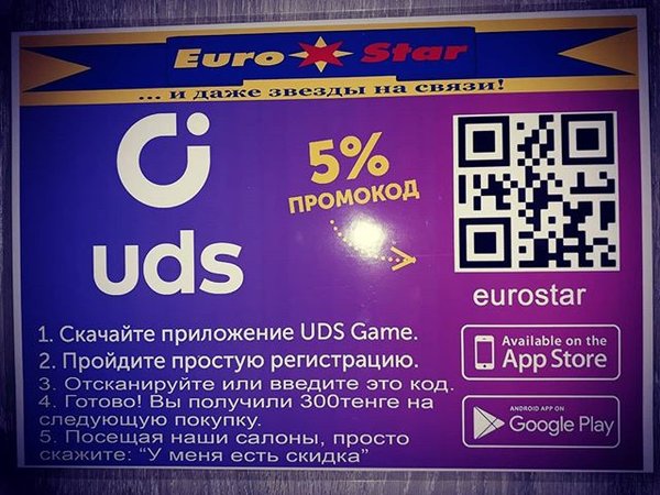 Установите приложение UDS и получайте скидки и подарки в сотнях магазинов вашего города. После регистрации введите промокод eurostar и получите свои первые 300 бонусов