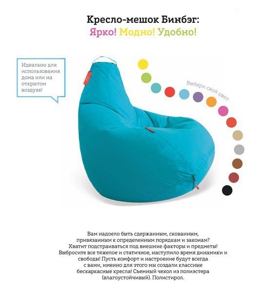 Сегодня bean bag (бинбэг — кресло-мешок) пользуется популярностью во всем мире. Из предмета роскоши они превратились в доступный предмет интерьера, сочетающий удобство, практичность и оригинальность.