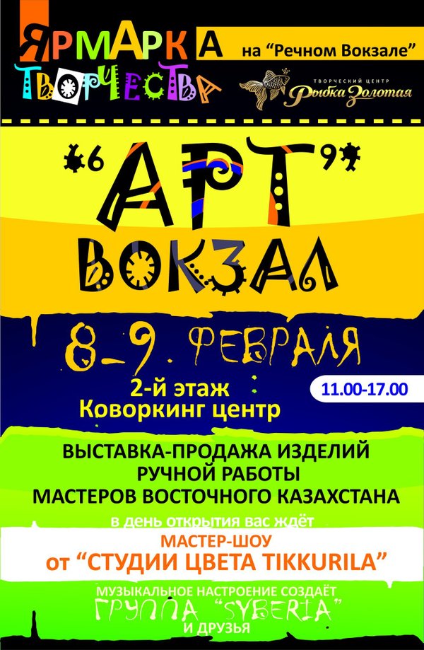Дорогие друзья!!! Гости и жители города Усть-Каменогорска!!! ТЦ «Рыбка Золотая» приглашает Вас на ярмарку прикладного искусства и ремесла — «АРТ Вокзал». ЦЕЛЫХ ДВА ДНЯ!!! 8 и 9 февраля!!! В преддверии многочисленных праздников Вы сможете приобрести уникальные подарки своим близким!