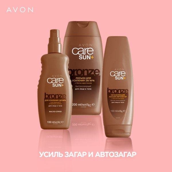 е. Гель, благодаря пантенолу в своем составе, отлично успокаивает кожу и борется с солнечными ожогами. А нежная формула масло-суфле дарит максимум увлажнения, которое так необходимо твоей коже после загара. ________________________________________________________________ Қола түсті күнқақтылық – кез-келген бикештің арманы. Бұған қол жеткізу үшін AVON Care Sun Bronze жаңа топтамасын пайдалан. Бет пен денеге арналған лосьон және май-сепкіш күнқақтылық үдерісін тездетіп, теріні қауіпсіз сіз армандаған қола түсті реңкке қол жеткізуге көмектеседі. Лосьон тез кебеді, ал май-сепкіш жағуға ыңғайлы. Авто қараю құралы теріге күнсіз де әдемі қола түсті реңк береді. Ал егер сен күнқақтылық әсерiн ұзаққа сақтағың келсе, AVON Қараюдан кейінгі Care Sun көмекке келеді. Денеге арналған сепкіш пен лосьон теріні жақсы салқындатып сергітеді және ылғалдандырады. Құрамындағы пантенолдың арқасында гель теріні керемет тыныштандырып, күн күюлерімен күреседі. Ал нәзік май-суфле сенің теріңе қараюдан кейін өте қажет барынша ылғал береді.