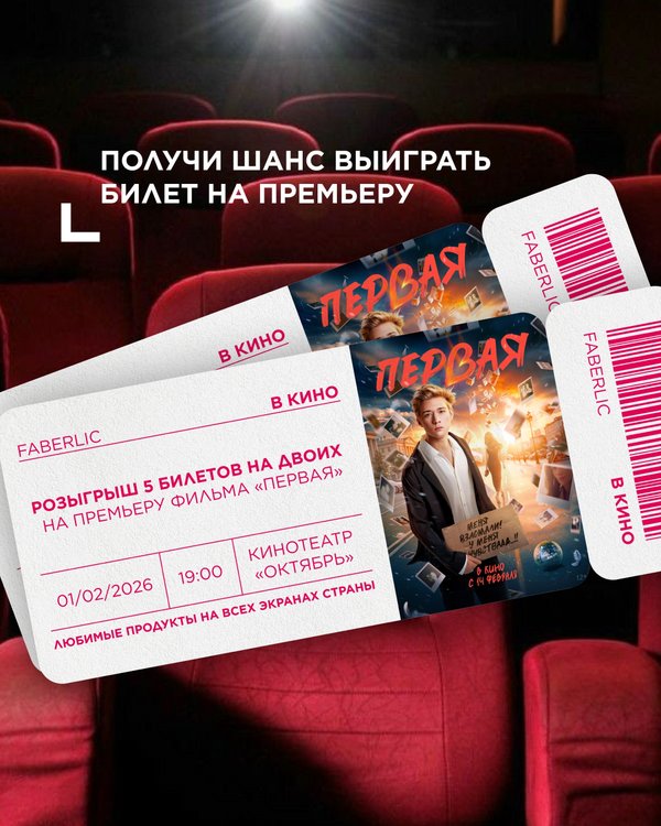 Faberlic в кино! Розыгрыш 5 билетов на премьеру фильма «Первая»! ️ Компания Faberlic стала официальным партнёром фильма «Первая»! С 14 февраля вы увидите нашу продукцию на всех экранах страны. А 1 февраля в 19:00 в кинотеатре «Октябрь» пройдёт специальный показ фильма с участием создателей и актеров. И сейчас мы разыгрываем 5 пригласительных билетов на двоих! Проведите этот вечер в атмосфере большого кино вместе с Faberlic. Розыгрыш проходит в Telegram-канале. Все условия ищите там Пусть этот вечер станет для вас незабываемым! Удачи! ️