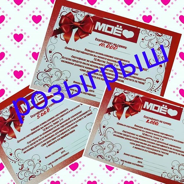 Итак, друзья! Объявляем Наш первый конкурс, посвященный Международному женскому дню Победителей будет трое 1место — сертификат на 10000 тг. 2место — сертификат на 5000 тг. 3место — сертификат на 2000 тг. Дата проведения: 26.02. - 07.03. Нельзя участвовать конкурсным, фейковым страничкам, бизнес аккаунтам, магазинам и тд. Условия: 1) Быть подписанным на наш акаунт moe_ukg 2) Сделать репост/скрин этого фото и поставить хештег #розыгрышid244695764 (moe_ukg) 3) Отметить на фото 5 друзей (только живые странички) и наш магазин 4) Под этим посто… — Читать дальше