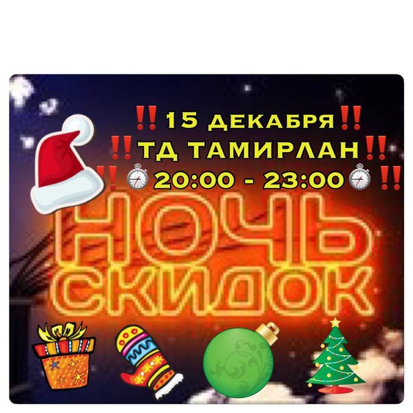 15.12.2016 ночь скидок в ТД ТАМИРЛАН на Абая 1/4 (напротив автостанции). Вас ждёт развлекательная программа и море скидок!!! ️ ⏰