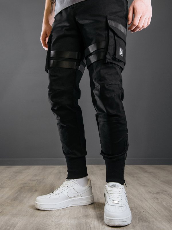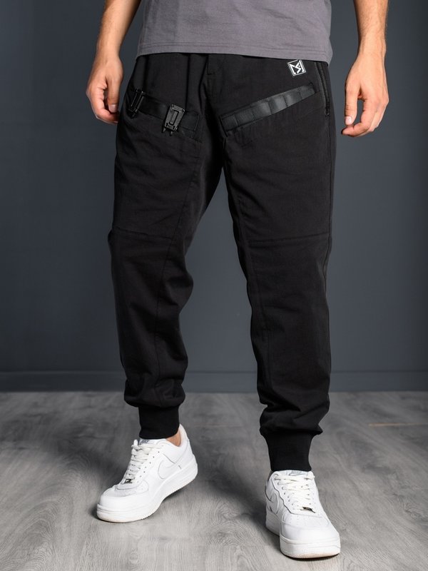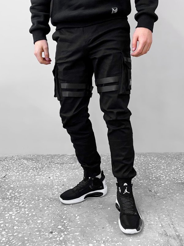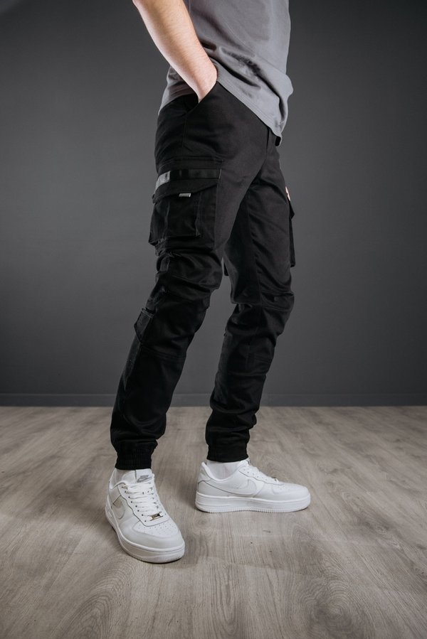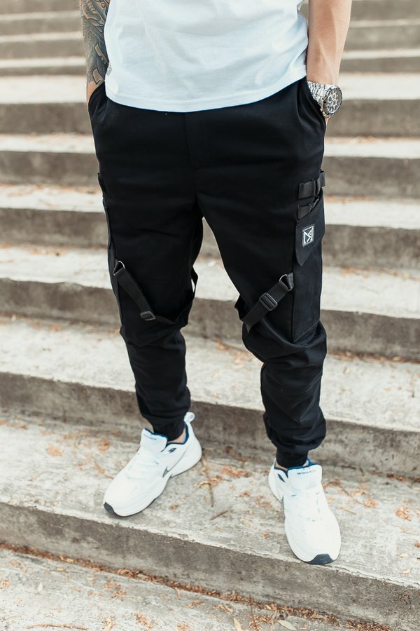 Модель «Brooklyn» в черной расцветке Выполнены из плотной ткани на основе натурального хлопка. Удобная посадка, прямой крой не сковывающий движения. Джоггеры оснащены двумя вместительными карманами спереди, врезными карманами сзади. Объёмные боковые карманы придают данной модели уникальный стиль.