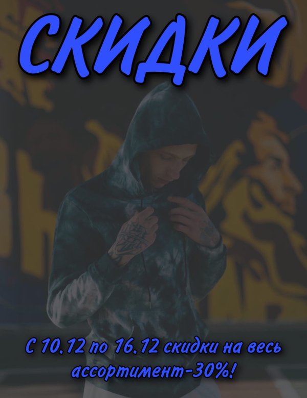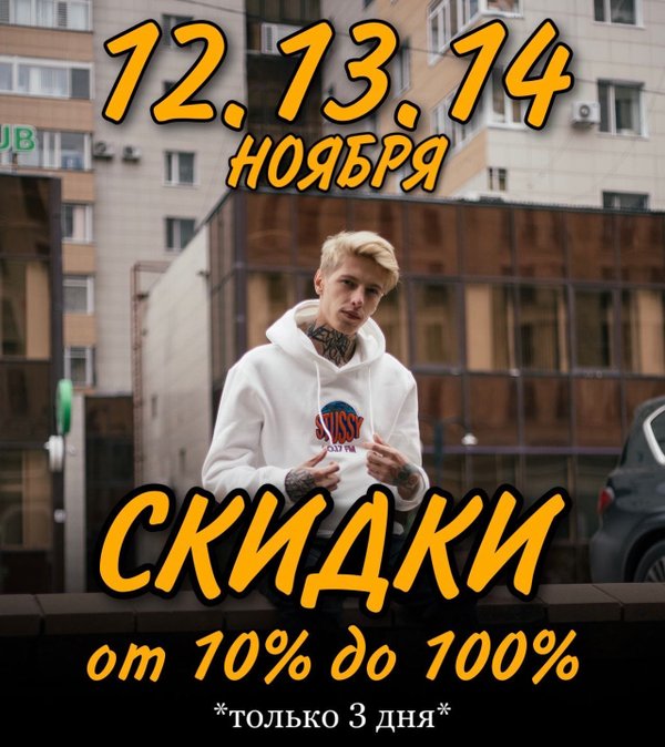 Объявляем скидки от 10% до 100% 100% включительно Нет, мы не сошли с ума Мы любим дарить вам радость и стиль! Итак. С 12.11 по 14.11 Скидки от 10% до 100% Скидка определяется методом жеребьёвки на кассе. Всем отличных покупок