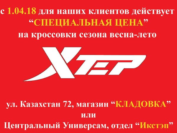 XTEP (ИКСТЭП) — удобно, легко, доступно, надежно (30.03.2018): Специально для наших клиентов мы максимально снизили цены на ряд моделей весна-лето. Все размеры в наличии. Торопитесь, пока есть выбор и широкий ассортимент! Ждем вас по адресу: улица Казахстан 72, магазин «КЛАДОВКА» или Центральный Универсам, отдел Икстэп (XTEP)