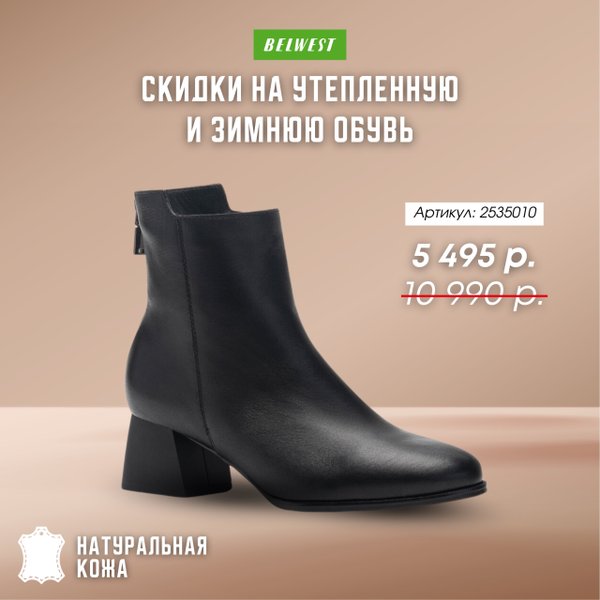 Это идеальный момент, чтобы обновить свой гардероб! Скидка 45% на утепленную осеннюю обувь из натуральной кожи. Элегантные сапоги или стильные ботинки подарят вашим ногам тепло и комфорт даже в самые холодные дни. Высокое качество материалов и продуманный дизайн сделают осень яркой и уютной ️ Не пропустите! Ждем вас на сайте и в магазинах BELWEST. *акция действует на выделенный ассортимент.