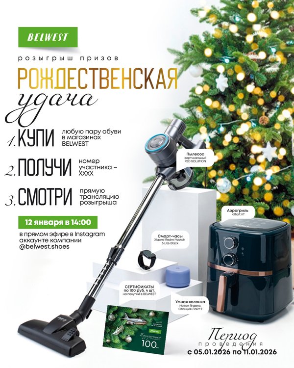 Вы просили и мы продлили! РОЖДЕСТВЕНСКАЯ УДАЧА с BELWEST! С 5 по 11 января покупайте обувь или сумки в магазинах BELWEST и получите возможность выиграть ценный подарок. Аэрогриль, умная колонка, вертикальный пылесос, смарт-часы или один из 4 сертификатов на 100 BYN в BELWEST могут стать Вашими. Победителей РОЗЫГРЫША определим 12 января в 14:00 в прямом эфире в Instagram, в аккаунте @belwest.shoes. участвуют только жители Республики Беларусь. Подробности на сайте belwest.by и по телефону 8029-899-11-88 Удачи!
