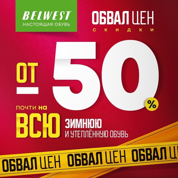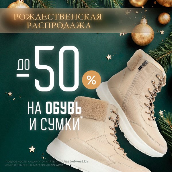 Рождественская распродажа в BELWEST Спешите за покупками на сайт belwest.com или в магазины вашего города. Там вы найдете много классных акций: скидки до 50% на зимнюю обувь скидки до 50% на утепленную обувь скидки до 50% на всесезонную обувь дополнительная скидка 10% на два товара в одном чеке скидки до 40% на сумки скидки до 50% на спортивную обувь скидки до 20% на тапочки