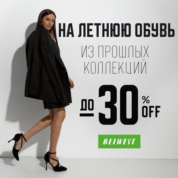 Спешите за покупками в магазины BELWEST или на сайт belwest.com Там вы найдете много классных акций: Скидки до 55% на летнюю обувь на выделенный ассортимент. Скидки до 50% на осеннюю обувь на выделенный ассортимент. Скидки до 35% на сумки. Большая распродажа всесезонной обуви — 99 р. 99 к., 79 р. 99 к., 59 р. 99 к. Дополнительная скидка 10% при покупке от двух товаров в одном чеке. Ждем вас за покупками прямо сейчас *акции действуют на территории Республики Беларусь