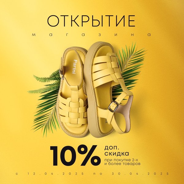 С 12.04.2025 по 30.04.2025 дарим дополнительную скидку 10% на покупку обуви в честь открытия магазина! Успейте приобрести качественную обувь из натуральной кожи, а также сумки и аксессуары.