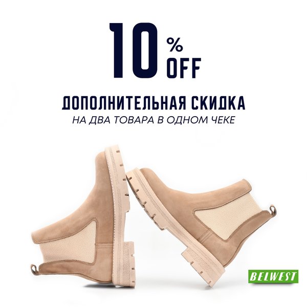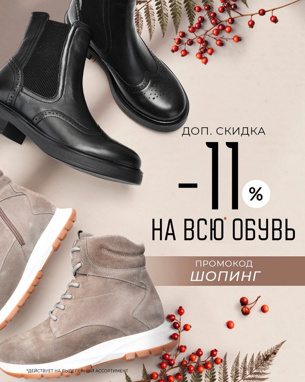Минус 11% на любимую обувь! Используй промокод ШОПИНГ до 12 ноября в магазинах BELWEST и получай дополнительную скидку −11% Действует на обувь: — осеннюю — зимнюю — всесезонную Не упусти возможность обновить гардероб выгодно *акция действует на территории Республики Беларусь. *подробности акции уточняйте в магазинах Вашего города или в инфоцентре