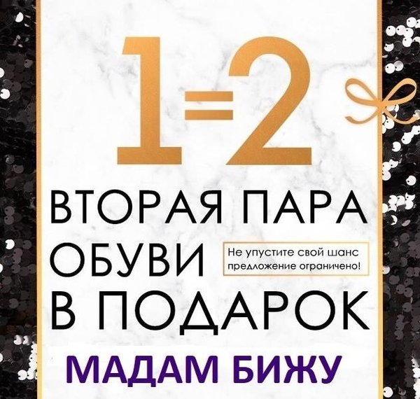 Татьяна Иванова (27.01.2019): Супер-предложение от Мадам Бижу! Купи одну пару обуви и получи ВТОРУЮ в ПОДАРОК! До конца зимы ещё 2 с месяца и вы с удовольствием их будете носить. 2 пары сапог лучше защитят ваши ножки от холодов и любой непогоды, чем одни. Приходите к нам за двойной выгодой и хорошим обслуживанием! Подпишись на наш скидочный аккаунт @salemadamb и узнаешь о наших выгодных предложениях первой