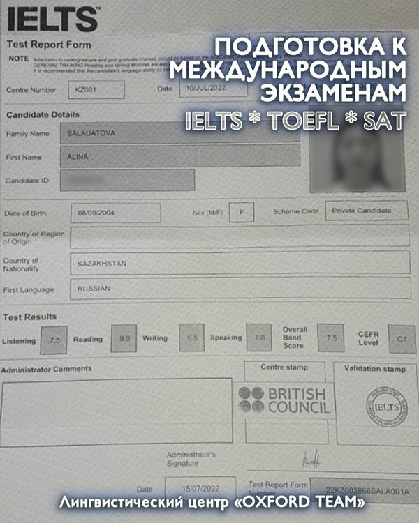 Очередные результаты наших студентов Если и вам нужна профессиональная помощь в подготовке к IELTS или другим международным экзаменам @oxfordteamkz обращайтесь к нам! Стоимость подготовки к IELTS, TOEFL, SAT: Индивидуальное обучение для всех возрастных категорий — 3 000 тг./час Обучение в группах для всех возрастных категорий — 14 000 тг./мес. (занятия 2 раза в неделю по 90 минут, либо 3 раза в неделю по 60 минут) Есть вопросы? Пишите нам в Direct или в нашем профиле @oxfordteamkz нажимайте кнопку «Контакты» «Позвонить »