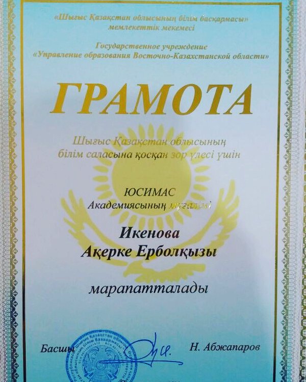 В честь празднования Дня учителя инструктора нашей Академии отмечены грамотами управления образования ВКО за вклад развития образования области! Это достойная награда наших инструкторов, ведь они воспитали 1 чемпиона Международных соревнований, 3 чемпионов и более 20 призеров Республиканских соревнований! ЮСИМАС это сила!!! Всех коллег по цеху поздравляем с наступающим профессиональным праздником!!!