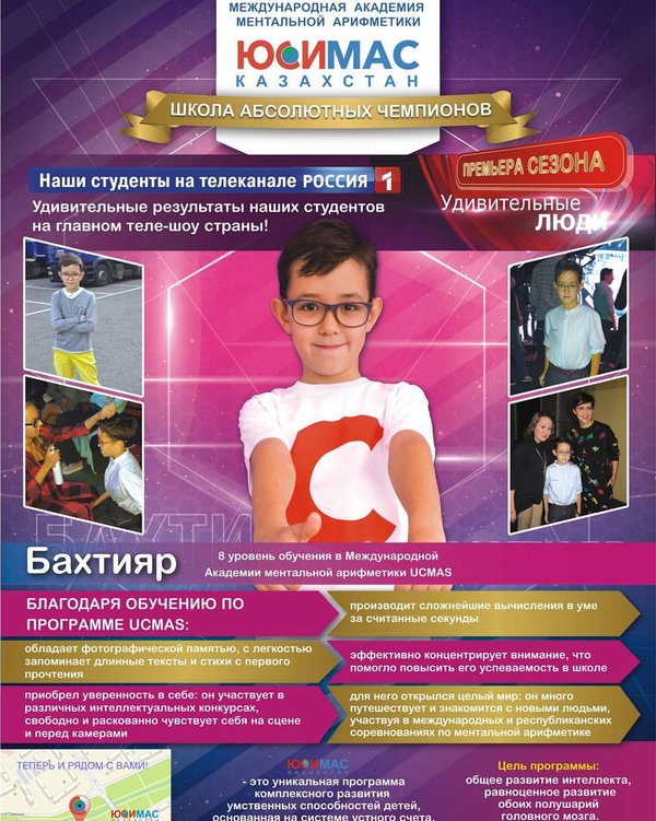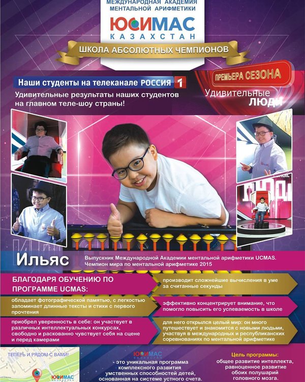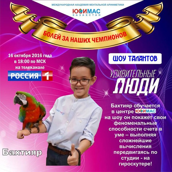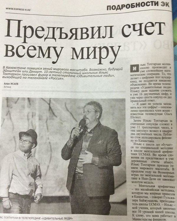 @brain_russia Уважаемые родители! Давайте поддержим нашего удивительного гения с Казахстана. Первым участником шоу «Удивительные Люди», в первом выпуске- 25 сентября в 18:00 по МСК времени выступит Ильяс Тохтархан — Выпускник программы Юсимас Казахстан- студент, закончивший все уровни обучения по нашей программе и ставший Чемпионом Мира по Ментальной Арифметики в 2015 году!