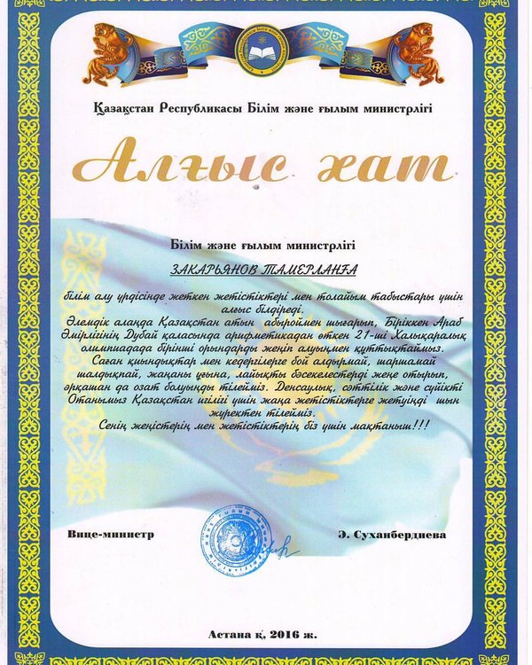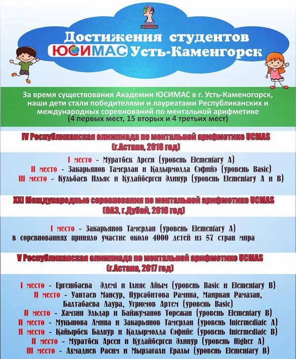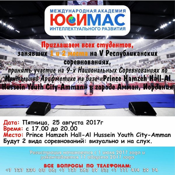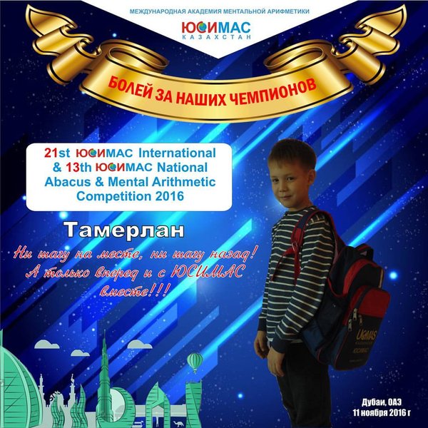 Отличная новость с ХХI международных соревнований по ментальной арифметики ЮСИМАС! Наш мальчик с Усть-Каменогорска Закарьянов Тамерлан занял «ПЕРВОЕ» место и еще раз доказал что наша Академия одна из самых сильных в мире! ЮСИМАС Усть-Каменогорск алға!!!