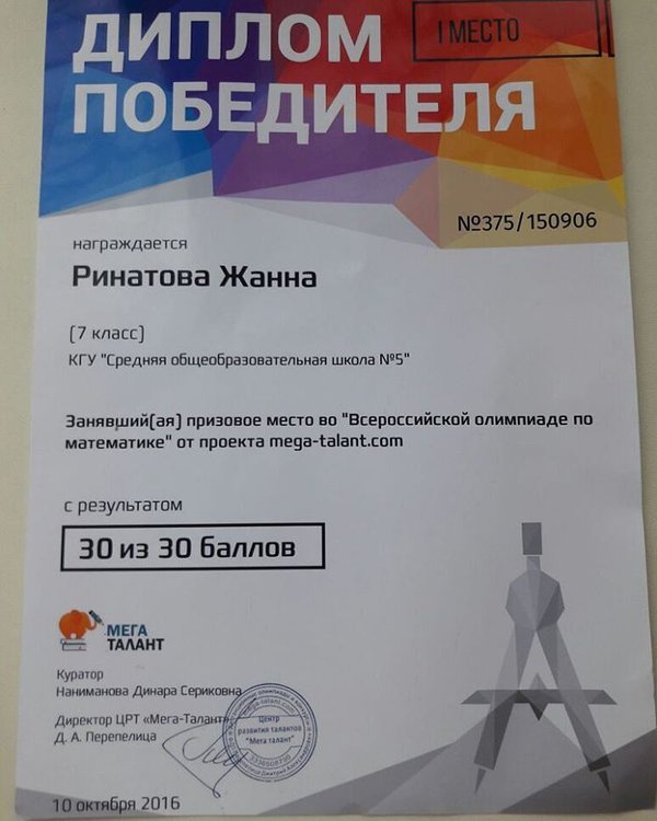 Поздравляем нашу студентку Ринатову Жанну с занятым 1-м местом на всероссийской олипиаде по математике! Желаем еще больше побед!!!