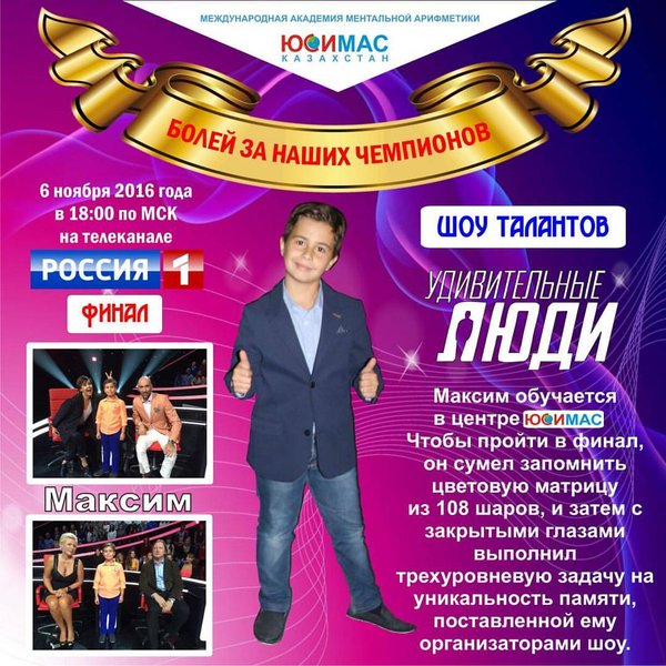 Тоғыз жасар Астаналық Максим Саруханов, Ресейлік «Россия 1» телеарнасының «Удивительные люди» дарындылар шоуының үшінші қазақстандық триумфаторы атанды. Максим телекөрермендер мен студия қонақтарына ЮСИМАС ментальды арифметика бағдарламасының көмегімен дамыта алған есте сақтау қабілетін көрсетті, ол жүзден аса шарлардан құралған түрлі-түсті матрицаны есінде сақтап, ұйымдастырушылар ұсынаған үш түрлі деңгейдегі жаттығуларды орындады. Нәтижесінде ол көрермендерді өзінің дарынымен тәнті еттіп ғана қоймай, шоу финалына өтті. Видеоға сілтеме