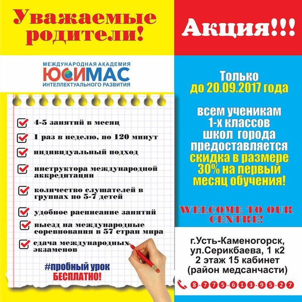 Спеши! Успей! Запишись! Не упусти момент! Только до 20 сентября 2017 года всем ученикам первого класса скидка на обучение 30% на один месяц! PS.: акция действует только для новеньких студентов!