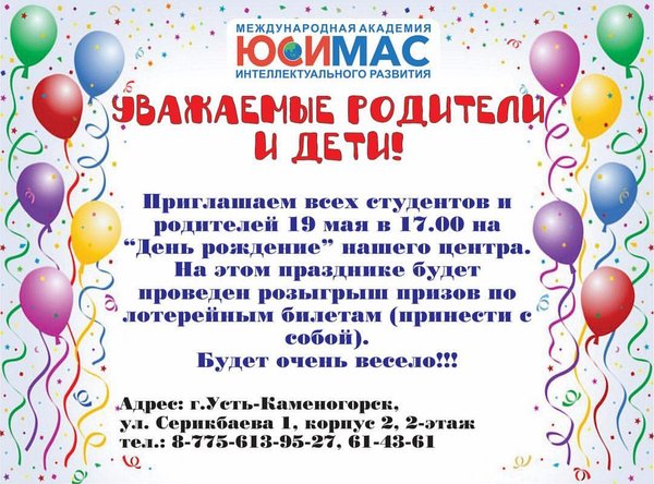 Приглашаем всеx студентов и родителей 19 мая в 17.00 в наш Центр по ул.Серикбаева 1, корпус 2 на День рождения нашего центра. На этом празднике будет проведен розыгрыш призов по лотерейным билетам (принести с собой). Будем рады видеть Вас на нашем общем празднике!