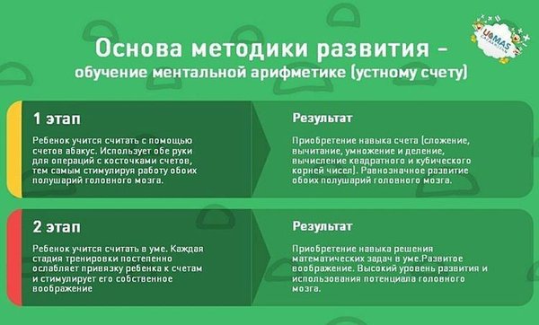 Основа методики развития – обучение ментальной арифметике (устному счету). Занятия в академии UCMAS продуктивны: ваш ребенок будет считать в уме быстрее вас, запоминать стихотворения после первого прочтения и номера телефонов родственников, лишь взглянув в записную книжку. Однако, главная цель программы UCMAS не обучить детей умению считать – это всего лишь бонус или подарок, который получит ребенок, когда закончит программу. Самое главное – это общее интеллектуальное развитие ребенка.