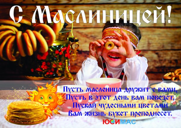 Международная Академия ЮСИМАС всех поздравляет с Масленицей! От всего сердца желает Вам, чтобы Ваши сердца простились со стужей, чтобы с вкусными блинами, маслом, медом да вареньем проводы зимушки удались на славу.