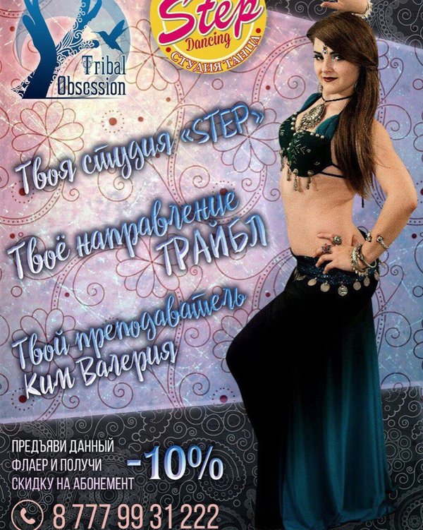 евать под любую песню, уместную Вашему образу и идее. 7. Научиться играть на музыкальном инструменте «Сагатах» 8.Научиться шить,вышивать, и заниматься различными видами рукоделия. 9. Выступать на городских мероприятиях, ездить на Трайбл Фестивали в другие города и страны. 10. Быть примером и вдохновением для других людей 11.Научиться любить себя 12. В Трайбле нет конкурсов и номинаций. Мы все равны-мы одно племя. 13. Мы первооткрывали Трайбл культуры в Восточно-Казахстанской Области и первая Трайбл группа в г. Усть-Каменогорск. 14.Возраст, вес, и умения абсолютно не имеют для нас значения- мы научим Всех! 15. Зал находится в центре города,на втором этаже, с душем со всеми удобствами и уютной профессиональной обстановкой. 16. Две действующие группы на разное удобное время. 17. Самые доступные цены на абонемент во всём городе! 18. Преподаватель постоянно занимается саморазвитием в данном направлении, проходит МК ведущих исполнителей этого стиля. Не является Самоучкой!