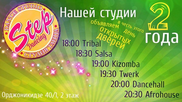 С ДНЕМ РОЖДЕНИЯ, dancestudio STEP!!! Нам 2 годика! Но несмотря на столь маленький возраст, наша студия успела достигнуть очень многого, сделала огромный шаг в развитии танцевальной культуры Усть-Каменогорска, начала по-настоящему раскачивать социальные танцы, устраивать различные мероприятия, масштабные (для нашего родного города) мастер классы, успела вырастить успешных и ярких учеников! И мы хотим давать больше, делать лучше, танцевать круче! И именно СЕГОДНЯ, 3 ФЕВРАЛЯ, мы даем ОТКРЫТЫЕ УРОКИ по нескольким направлениям, это: TRIBAL … — Читать дальше