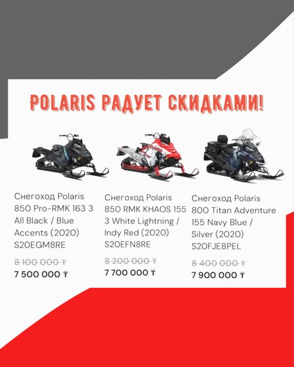 Вау Радостная новость Вы только посмотрите на новые цены от POLARIS Кому снегоход? По всем вопросам: ⠀ Обращайтесь в директ @royalauto_ukg ⠀ Заходите на наш сайт: ⠀ Или звоните по телефонам: ⠀ 8-7232-74-00-47 8771-086-56-56 (WhatsApp ⠀ Наш адрес: пр. Абая 156/1, г. Усть-Каменогорск, Республика Казахстан ⠀