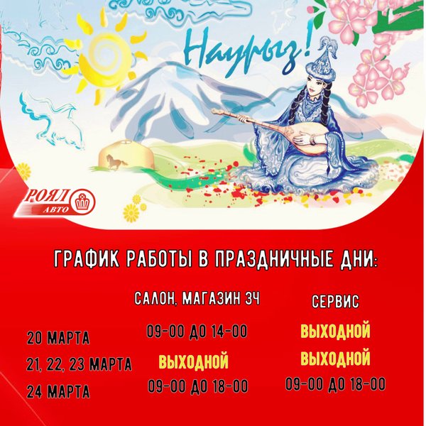 Пускай Наурыз Вам принесет Добро, удачу и здоровье, Стабильный и большой доход, Наполнит Вашу жизнь любовью! Желаем мира Вам, уюта, В душе — лишь света и тепла, Чтоб в жизни каждая минута Большое счастье Вам несла! Ваш Роял Авто