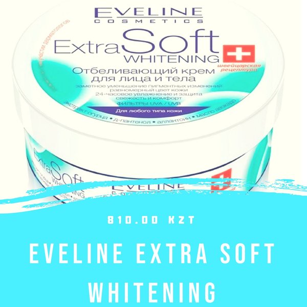Eveline EXTRA SOFT WHITENING — ОТБЕЛИВАЮЩИЙ КРЕМ ДЛЯ ЛИЦА И ТЕЛА Цена: 810.00 KZT Отбеливающий крем для лица и тела. Заметное уменьшение пигментных изменений,равномерный цвет кожи. 24-часовое увлажнение и защита. Свежесть и комфорт. Дукен.кз это не просто магазин с кучей товаров. Дукен – Ваш помощник в Ваших каждодневных хлопотах. Мы берем на себя бытовую трату времени на простои в очередях, или беспорядочные метания мимо тысячи прилавков. Мы предлагаем Вам совершенно новый вид покупок и хозяйственных товаров. У нас есть: Детское питание, бакал… — Читать дальше